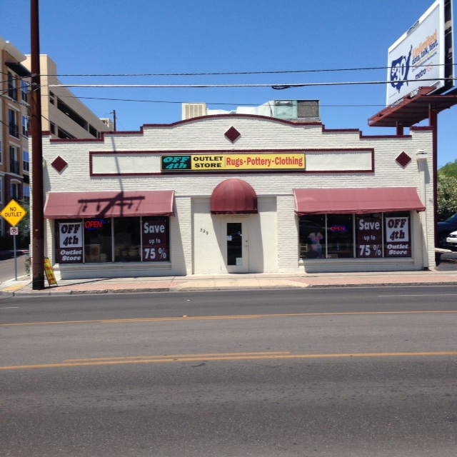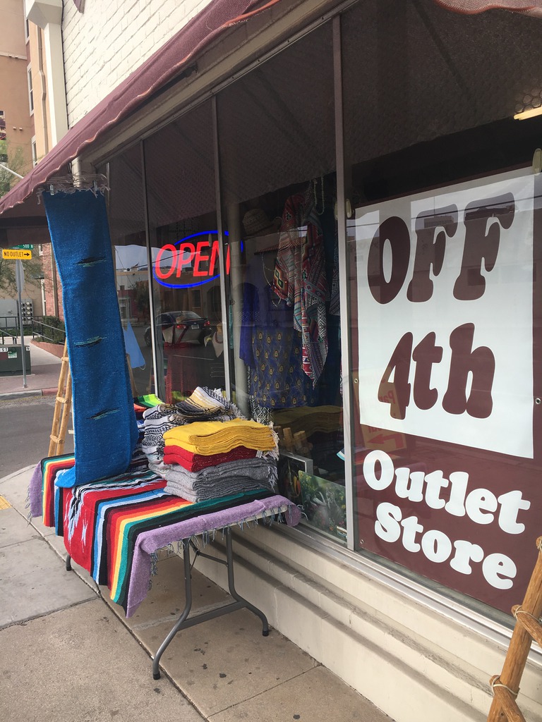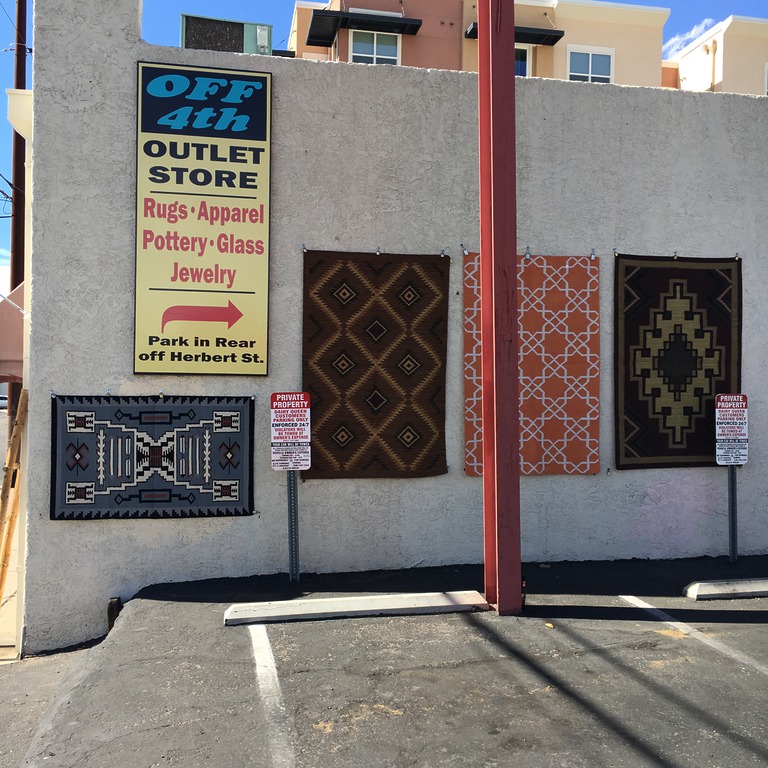 Off Fourth Outlet Store is 1/4 block off Fourth Avenue next to Dairy Queen. You’ll find great bargains on Handwoven and Hand Knotted rugs, ladies wear, silver jewelry, Pueblo style ladders, Pottery, beads, and so much more. We have a HUGE 50% off section that is a TRUE 50% off sale. All items at 50% off have been in our store at full price for at least one month or more.